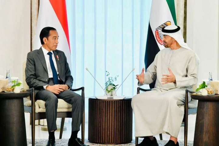 Jakarta: Presiden Joko Widodo (Jokowi) melakukan pertemuan dengan Presiden Persatuan Emirat Arab (PEA) Sheikh Mohamed bin Zayed (MBZ) bin Sultan Al Nahyan di Istana Al Shatie, Abu Dhabi, Jumat, 1 Juli 2022.