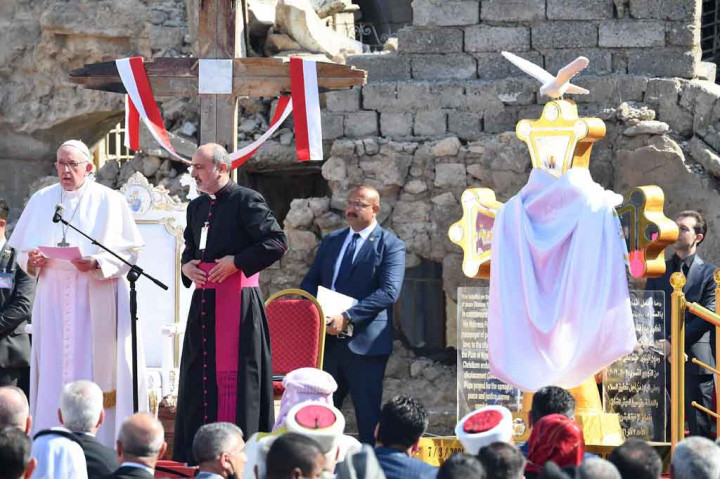 "Kami umat beriman tidak bisa diam ketika terorisme melanggar agama," kata Paus Fransiskus pada kebaktian antaragama Sabtu, 6 Maret 2021, salah satu dari banyak perhentian pada kunjungan paus pertama ke negara yang dilanda perang itu.