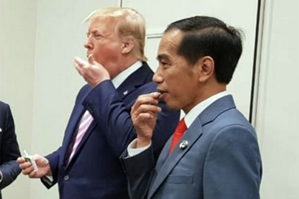 Osaka: Saat menantikan sesi 'official welcome' dan 'family photo', Presiden Jokowi sempat berbincang bersama kepala negara, kepala pemerintahan negara G20, dan juga pimpinan lembaga internasional dalam suasana yang akrab. Pada kesempatan tersebut Presiden AS Donald Trump sempat memberikan permen kepada Jokowi. Dok: Biro Pers Setpres Cek Berita dan Artikel yang lain di Google News