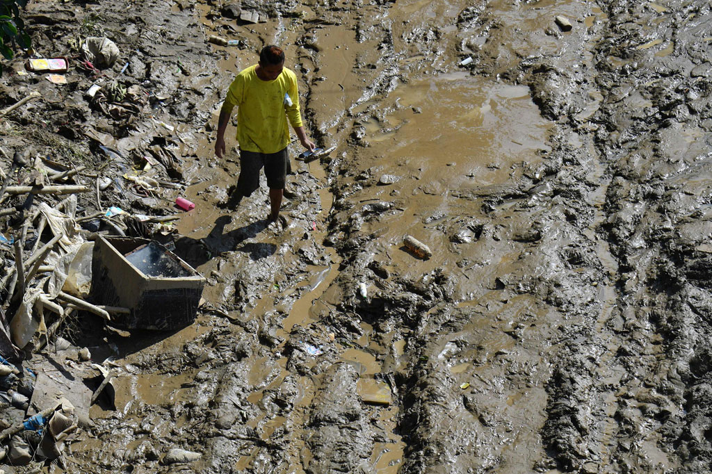 Topan Vamco yang membawa hujan deras disertai banjir bandang menyisakan sampah dan lumpur tebal di permukiman warga.