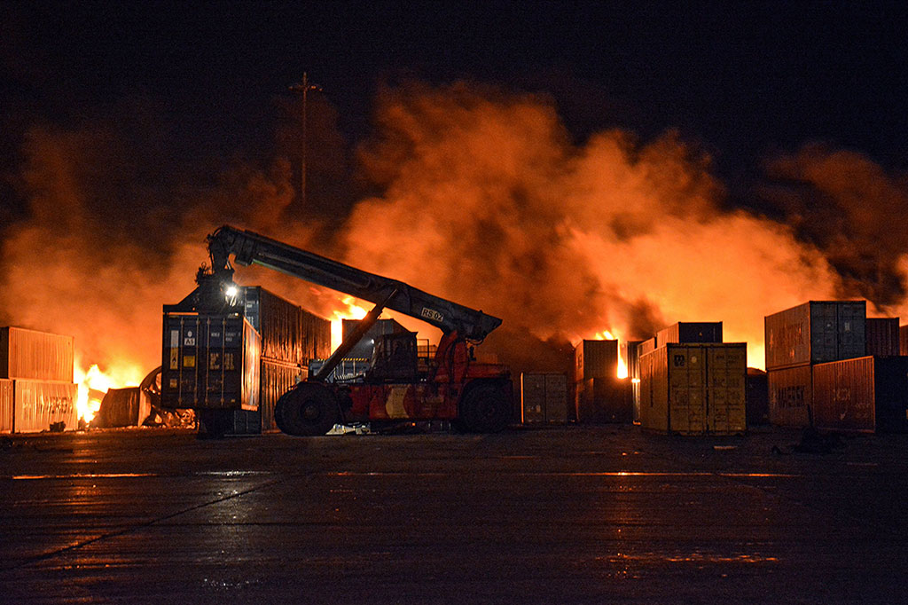Petugas pemadam kebakaran berjuang memadamkan kobaran api pascaserangan udara Israel menghantam Pelabuhan Latakia, Suriah, Selasa, 28 Desember 2021. Ini merupakan serangan kedua di fasilitas utama di Suriah bulan ini.