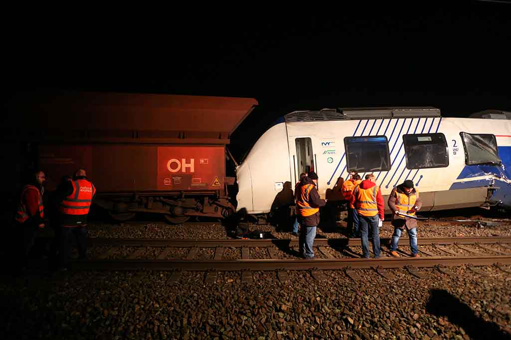 Duesseldorf: Sekitar 50 orang luka-luka setelah insiden tabrakan antara kereta penumpang dengan kereta barang di dekat Kota Duesseldorf, Jerman pada Selasa, 5 Desember 2017 malam waktu setempat. Kecelakaan itu terjadi di dekat Stasiun Meerbusch-Osterath. AFP/Ina Fassbender Cek Berita dan Artikel yang lain di Google News