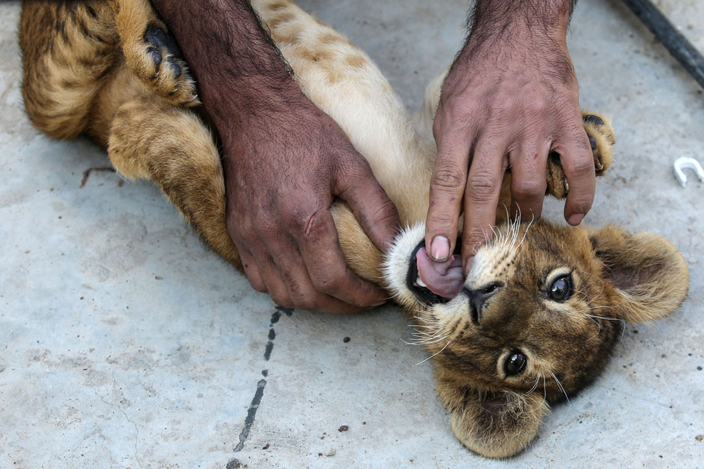 Anak singa jantan dan betina berusia 75 hari, Fathy dan Filisteen (Palestina), telah menjadi mainan bagi tetangga dari pemiliknya, pemilik toko roti Naseem Abu Jamea, meskipun para ahli hewan mengungkapkan keprihatinannya mendengar situasi tersebut.