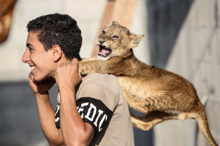Jalur Gaza: Di atap blok apartemen di salah satu kota paling padat di Gaza, dua anak singa berkeliaran di antara tangki air dan makan ayam yang disembelih, saat anak-anak tengah berfoto selfie.