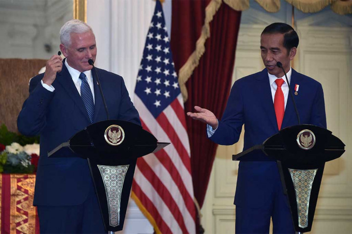 Metrotvnews.com, Jakarta: Presiden Joko Widodo menyambut baik komitmen Amerika Serikat yang bertekad menguatkan kerja sama dan kemitraan strategis dengan Indonesia dalam berbagai bidang termasuk perdagangan, investasi, dan perdamaian. Hal itu disampaikan Presiden Jokowi dalam pernyataan pers bersama Wakil Presiden AS Michael Richard Pence di Istana Merdeka, Jakarta, Kamis (20/4/2017). AFP/Pool/Bay Ismoyo/Dita Alangkara Cek Berita dan Artikel yang lain di Google News