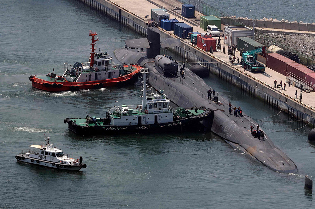 SSGN kelas Ohio, USS Michigan, memasuki pangkalan angkatan laut utama di Busan, 320 kilometer tenggara Seoul, setelah Korut menembakkan dua rudal balistik jarak pendek ke arah Laut Timur pada Kamis, 15 Juni, sebagai bentuk protes terhadap latihan penembakan langsung besar-besaran Korsel-AS yang berakhir sebelumnya pada hari tersebut.