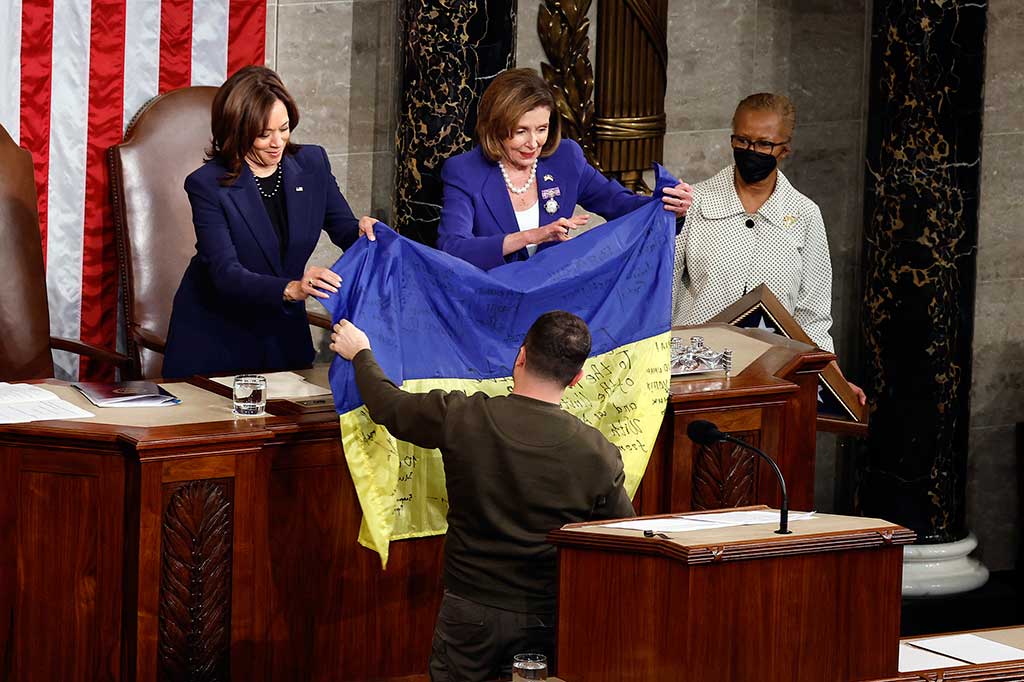 Presiden Ukraina Volodymyr Zelensky memberikan bendera pertempuran Ukraina kepada Ketua DPR AS Nancy Pelosi kanan dan Wakil Presiden Kamala Harris saat berpidato di pertemuan gabungan Kongres di di Washington, DC, Rabu, 21 Desember 2022 waktu setempat.