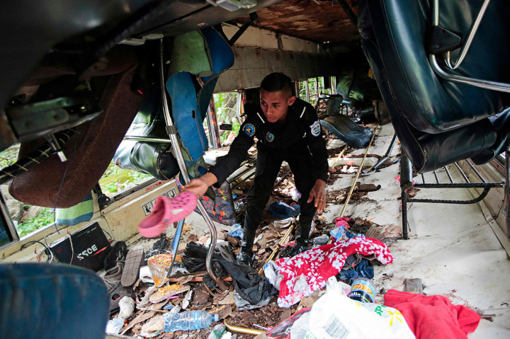 Pada hari Kamis, bus tetap terbalik di jurang, yang dalamnya sekitar 80 meter (260 kaki), seorang reporter AFP di tempat kejadian mengatakan. Sopir bus telah ditangkap dan dibawa ke kantor polisi.
