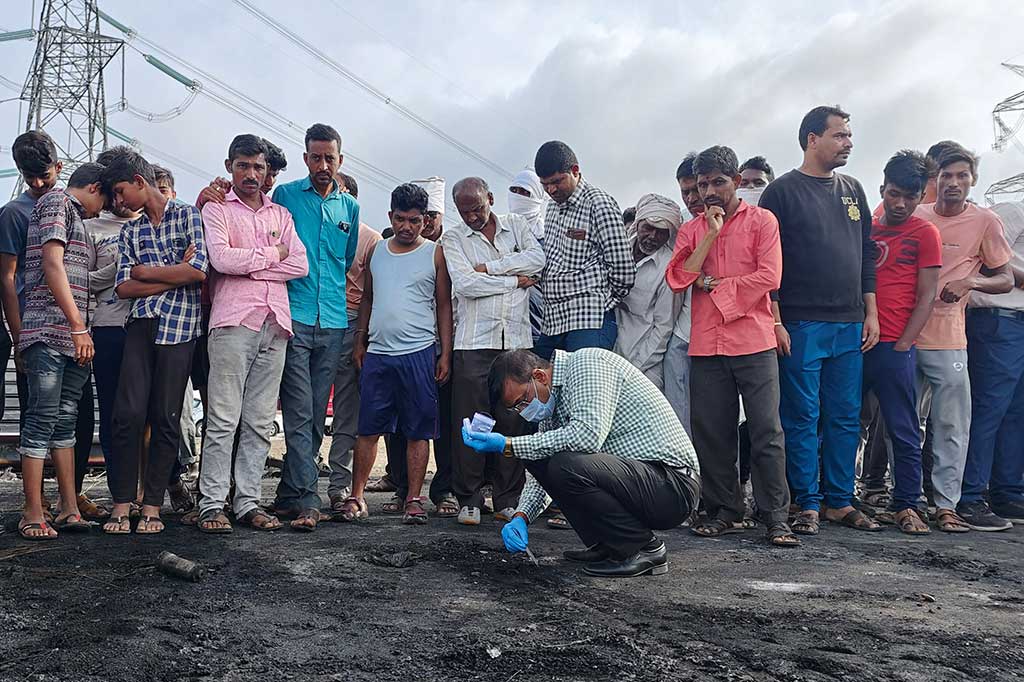Orang-orang berkumpul di samping sisa-sisa bus (latar belakang) yang terbakar di sepanjang Jalan Tol Samruddhi dekat Sindkhed Raja di distrik Buldhana negara bagian Maharashtra pada Sabtu, 1 Juli 2023. Sedikitnya 25 orang tewas dan delapan lainnya luka-luka setelah sebuah bus terbakar semalam di jalan tol di negara bagian Maharashtra India.