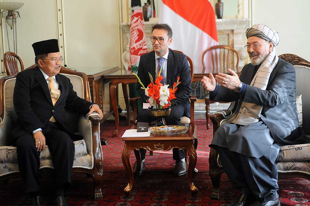 Kabul: Wapres Jusuf Kalla bertemu dengan Chairman High Peace Council Y.M Mohammad Karim Khalili di Istana Haram Sarai, Kabul, Afghanistan, Selasa, 27 Februari 2018 malam waktu setempat. Di Afghanistan Jusuf Kalla akan menjadi pembicara tamu dan berbagi pengalaman dalam upaya perdamaian di Kabul Peace Process Conference. Foto: Tim Media Wapres Cek Berita dan Artikel yang lain di Google News
