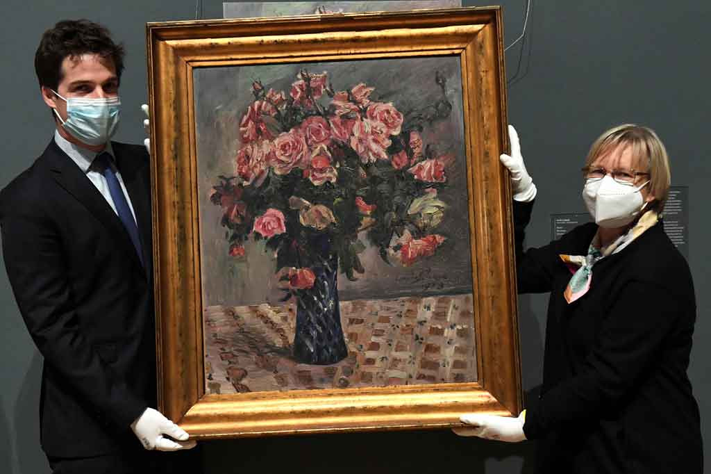 Lukisan bunga merah muda dalam vas biru karya seniman Jerman Lovis Corinth pada 1931 tersebut adalah milik Gustav dan Emma Mayer, yang meninggalkan rumah mereka di Frankfurt pada 1938 ke Brussel. Mereka tiba di Inggris pada Agustus 1939.