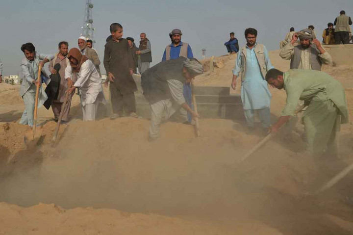 Kabul: Para pelayat dari komunitas minoritas Syiah Afghanistan memakamkan jenazah korban serangan bom bunuh diri di sebuah masjid, Sabtu, 9 Oktober 2021. Bom bunuh diri yang diklaim oleh kelompok Negara Islam ISIS-K tersebut mengakibatkan lebih dari 60 orang meninggal dunia.
