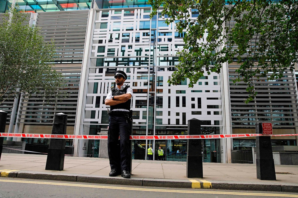 Garis polisi telah dipasang di sekitar pintu masuk Kementerian Dalam Negeri Inggris, sementara petugas keamanan dan petugas polisi berdiri di luar. Dua mobil polisi ditempatkan di luar dengan beberapa lainnya diparkir di dekatnya.