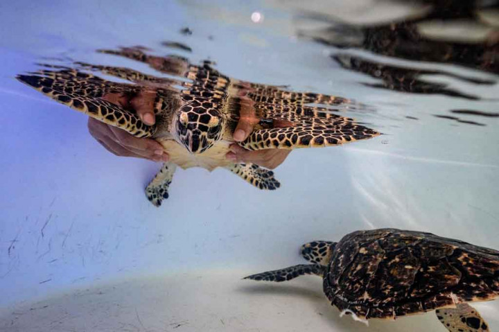 "Dalam 56 persen kasus, penyu yang dibawa ke kami menelan limbah laut atau terperangkap di dalamnya," kata Dr Patcharaporn Kaewong dari Pusat Biologi Kelautan Phuket.  AFP PHOTO/Lillian Suwanrumpha