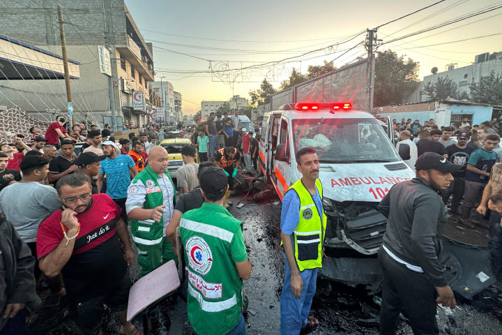 Seorang jurnalis AFP di lokasi serangan melihat banyak jenazah di samping ambulans yang rusak di luar rumah sakit, yang penuh sesak dengan warga sipil yang mencari perlindungan dari pemboman Israel serta mereka yang terluka.