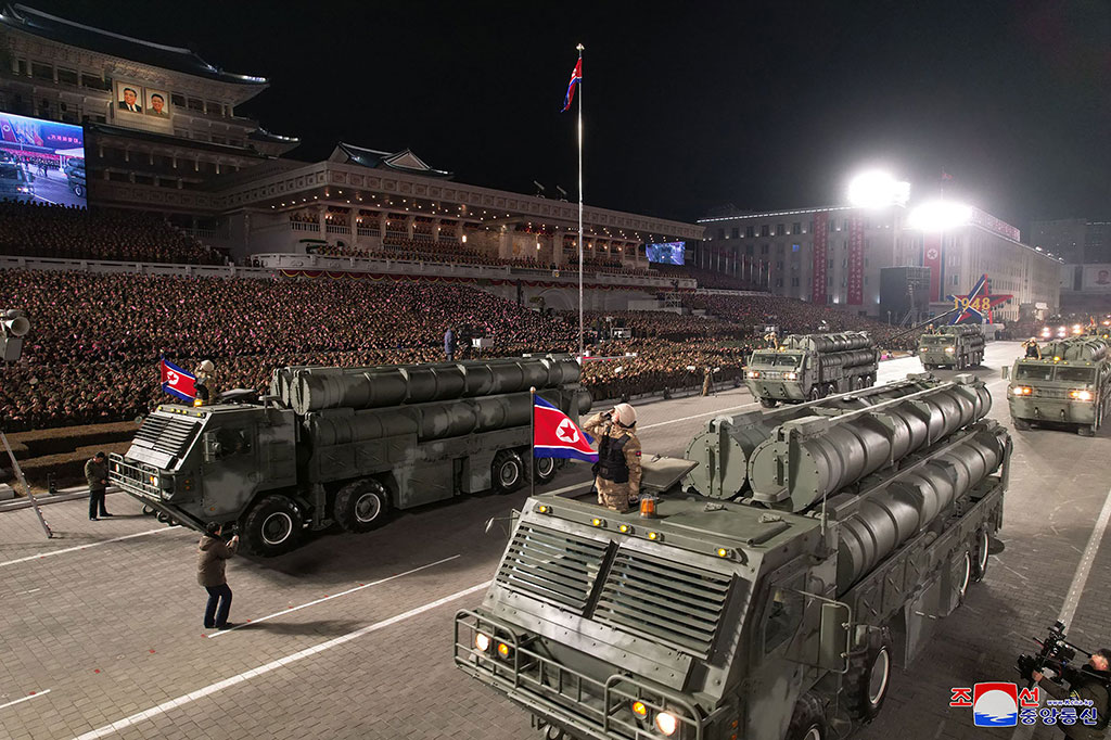 Peluncur rudal juga diarak melalui alun-alun, KCNA melaporkan, termasuk unit operasi nuklir taktis yang memamerkan kemampuan pencegahan perang dan serangan balik yang kuat.
