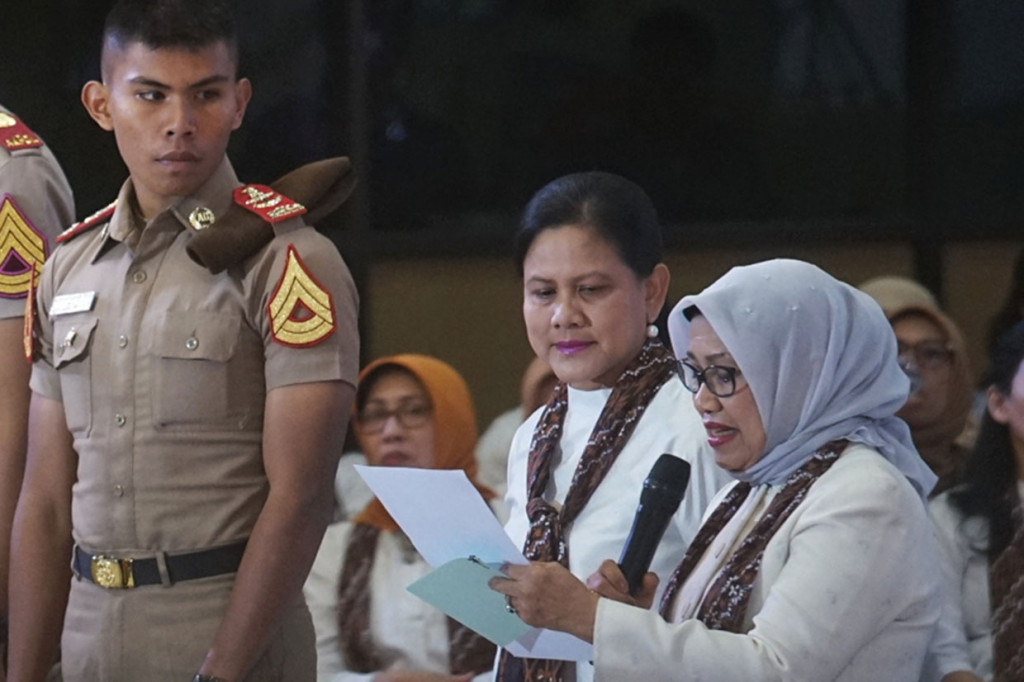 Sleman: Ibu Negara Iriana Joko Widodo bersama istri Wakil Presiden Mufidah Jusuf Kalla dan sejumlah istri menteri yang tergabung dalam Organisasi Aksi Solidaritas Era (OASE) Kabinet Kerja mengunjungi Kesatrian Akademi Angkatan Udara (AAU) Yogyakarta, Jumat, 6 September 2019. Di tempat tersebut Iriana melakukan sosialisasi bahaya narkoba, hoaks, perundungan, dan pornografi kepada Taruna Akademi TNI dan Polri. Antara Foto/Andreas Fitri Atmoko