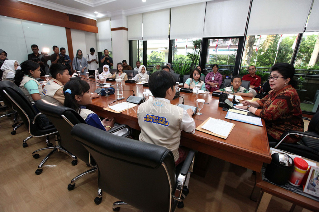 Jakarta: Berbagai isu kesehatan ditanyakan 10 anak yang tergabung dalam Reporter Cilik (Repcil) Media Anak terbaik kepada Menteri Kesehatan Nila Moeloek, di Kantor Kementerian Kesehatan, Kuningan, Jakarta, Rabu, 24 Juli 2019. Wawancara eksklusif tersebut bertepatan dengan Hari Anak Nasional yang jatuh pada 23 Juli. MI/Rommy Pujianto Cek Berita dan Artikel yang lain di Google News