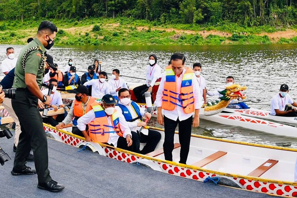 Jokowi mendayung perahu naga bersama Menteri Sekretaris Kabinet Pramono Anung, Menteri PUPR Bosoeki Hadimoeljono, Ketua DPRD Sultra Abdrrahman Shaleh, sedangkan bertindak sebagai dramer Menteri Investasi Bahlil Lahadalia.
