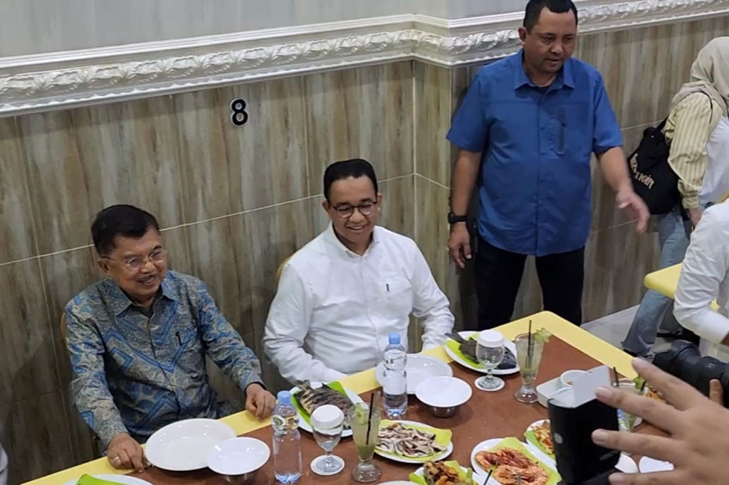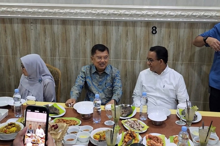 Makassar: Calon presiden (capres) nomor urut 1 Anies Baswedan santap malam bareng Wakil Presiden (Wapres) ke-10 dan ke-12 RI, Jusuf Kalla (JK) di Makassar, Sulawesi Selatan. Anies makan sejumlah menu olahan ikan dan sup.