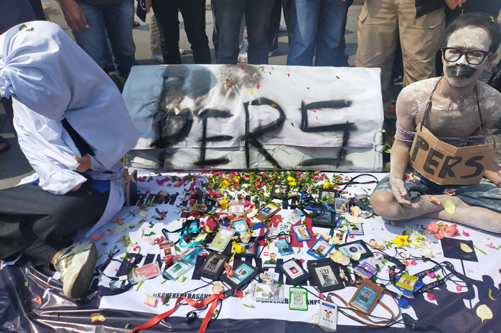 Tasikmalaya: Puluhan jurnalis Ikatan Jurnalis Televisi Indonesia (IJTI), Aliansi Jurnalis Independen (AJI) dan mahasiswa yang tergabung dalam Forum Jurnalis Tasikmalaya melakukan unjuk rasa menolak revisi undang-undang (RUU) penyiaran nomer 32 tahun 2002 yang dinilai berpotensi menghalangi tugas jurnalis dan kebebasan pers.
