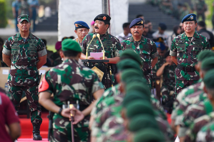 Jakarta: Personel gabungan TNI dan Polri menggelar apel gelar pasukan pengamanan dalam rangka persiapan pengamanan pengambilan sumpah jabatan dan pelantikan Joko Widodo-Ma'ruf Amin sebagai Presiden-Wapres periode 2019-2024. Apel digelar di Lapangan Silang Monas, Jakarta, Kamis, 17 Oktober 2019. Antara Foto/Nova Wahyudi Cek Berita dan Artikel yang lain di Google News