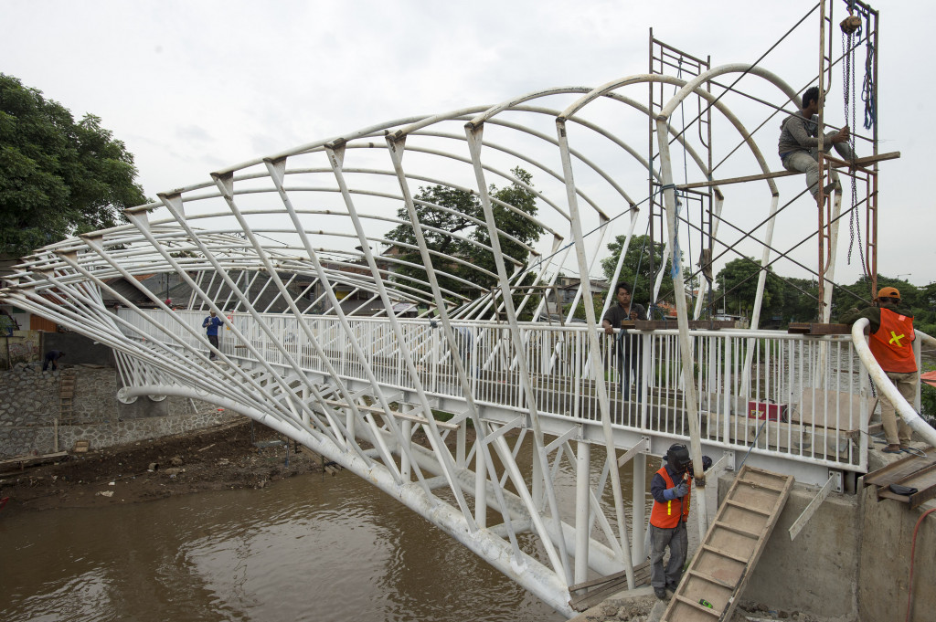 Metrotvnews.com, Jakarta: Sebuah jembatan penyeberangan orang (JPO) yang dibangun di atas Sungai Ciliwung di kawasan Manggarai, Jakarta, Kamis (31/3/2016), tengah dalam tahap penyelesaian. JPO yang menghubungkan kawasan Menteng Tenggulun dan Manggarai tersebut dibangun untuk menggantikan transportasi perahu eretan yang selama ini digunakan warga. ANTARA/Widodo S Jusuf Cek Berita dan Artikel yang lain di Google News