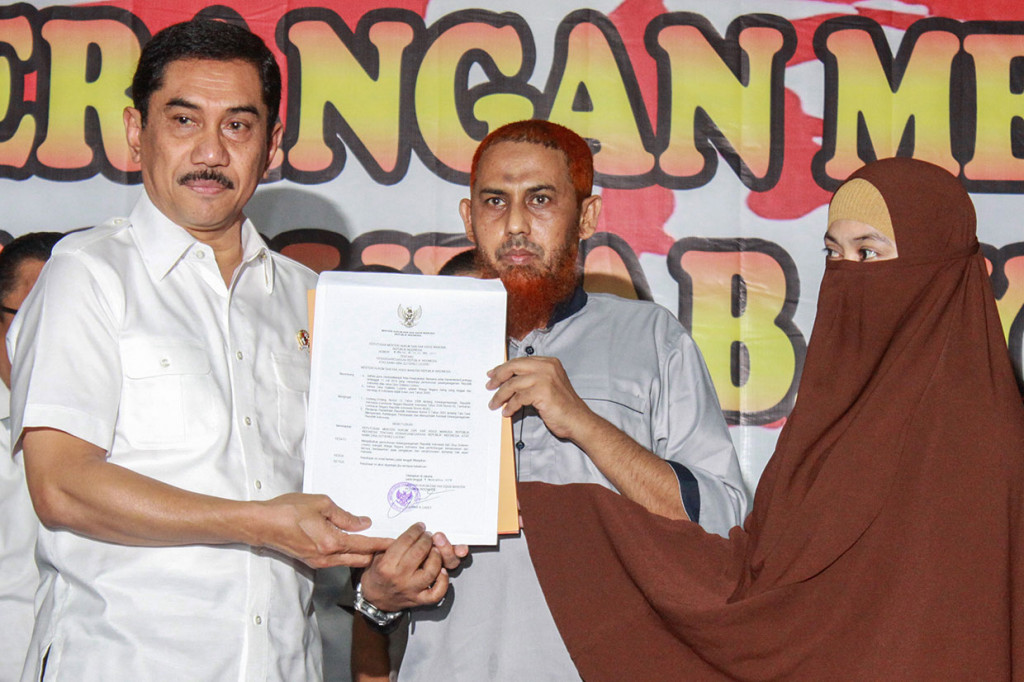 Kepala Badan Nasional Penanggulangan Terorisme (BNPT) Komjen Suhardi (kiri) menyerahkan surat keputusan kepada narapidana terorisme Umar Patek (tengah) dan istrinya Gina Gutierez atau Ruqayyah binti Husein Luceno di Lapas Kelas 1 Surabaya di Porong, Sidoarjo, Jawa Timur, Rabu, 20 November 2019.
