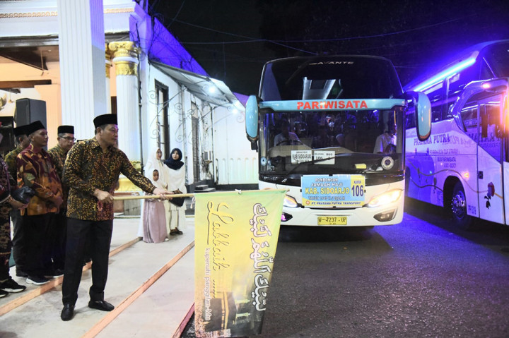 Sidoarjo: Kloter terakhir calon jemaah haji (CJH) asal Kabupaten Sidoarjo diberangkatkan dari Pendopo Delta Wibawa menuju Asrama Haji Sukolilo, Surabaya, Minggu, 9 Juni 2024 malam.
