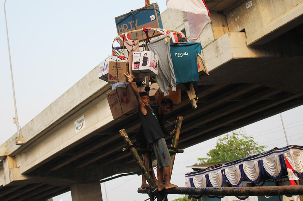 Jakarta: Dalam rangka memeriahkan HUT ke-78 RI, lomba 'Jalan Pinang' kembali digelar di Jalan Laksamana Malahayati, wilayah RW 02, Kelurahan Cipinang Melayu, Kecamatan Makasar, Jakarta Timur, Kamis, 17 Agustus 2023. Sebelumnya kegiatan tersebut sempat ditiadakan lantaran masih dalam situasi pandemi covid-19.