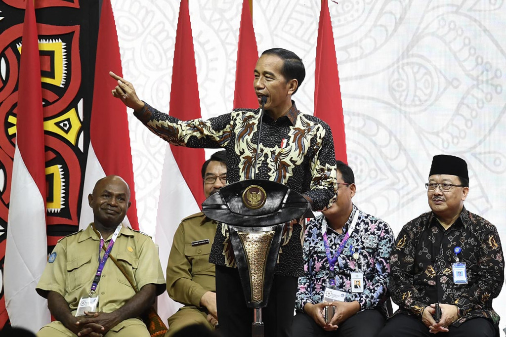 Depok: Presiden Joko Widodo membuka Rembuk Nasional Pendidikan dan Kebudayaan di Pusat Pendidikan dan Latihan Kemendikbud, Sawangan, Depok, Jawa Barat, Selasa, 12 Februari 2019. Jokowi meminta agar guru terampil jumlahnya lebih banyak ketimbang guru normatif, guna meningkatkan kreativitas SDM Indonesia. Hal ini khususnya berlaku di SMK. Antara Foto/Puspa Perwitasari Cek Berita dan Artikel yang lain di Google News