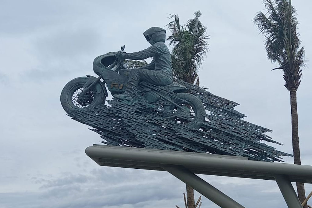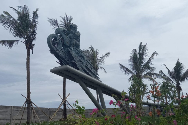 Praya: Patung Presiden Joko Widodo (Jokowi) yang tengah mengendarai motor custom telah terpasang di depan pintu masuk Sirkuit Mandalika, Lombok Tengah, NTB. Patung tersebut kini menjadi ikon titik foto bagi wisatawan maupun penonton MotoGP 2022 Mandalika.