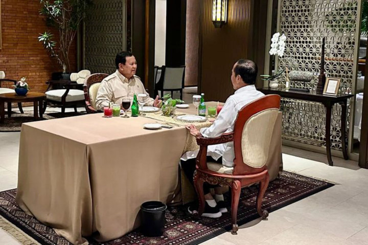 Jakarta: Presiden Joko Widodo dan Presiden Terpilih Prabowo Subianto santap malam dan berdiskusi di sebuah restoran di Jakarta, Selasa, 8 Oktober 2024. Pembicaraan keduanya hingga dua jam lebih.