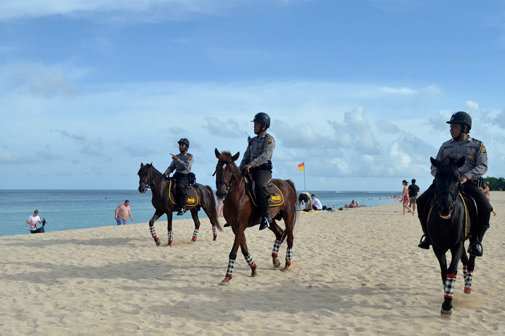 Metrotvnews.com, Denpasar: Polisi berkuda berpatroli di pantai sekitar hotel tempat Raja Arab Saudi Salman bin Abdulaziz Al-Saud menginap di kawasan Nusa Dua, Bali, Kamis (9/3/2017). Patroli tersebut dilakukan untuk menjamin keamanan rombongan Raja Salman yang memperpanjang masa liburan di Pulau Dewata hingga 12 Maret 2017. ANTARA/Fikri Yusuf Cek Berita dan Artikel yang lain di Google News