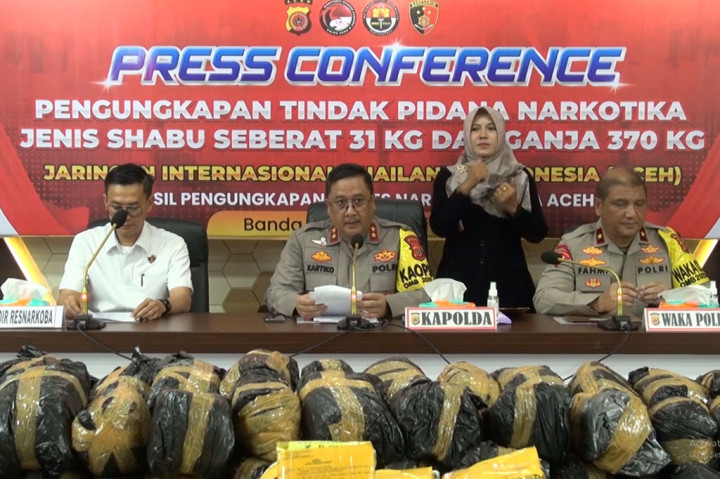 Aceh: Direktorat Reserse Narkoba Kepolisian Daerah Aceh menggagalkan penyelundupan narkotika jenis sabu seberat 31 kilogram dan ganja 370 kilogram yang berasal dari jaringan internasional Thailand-Indonesia.