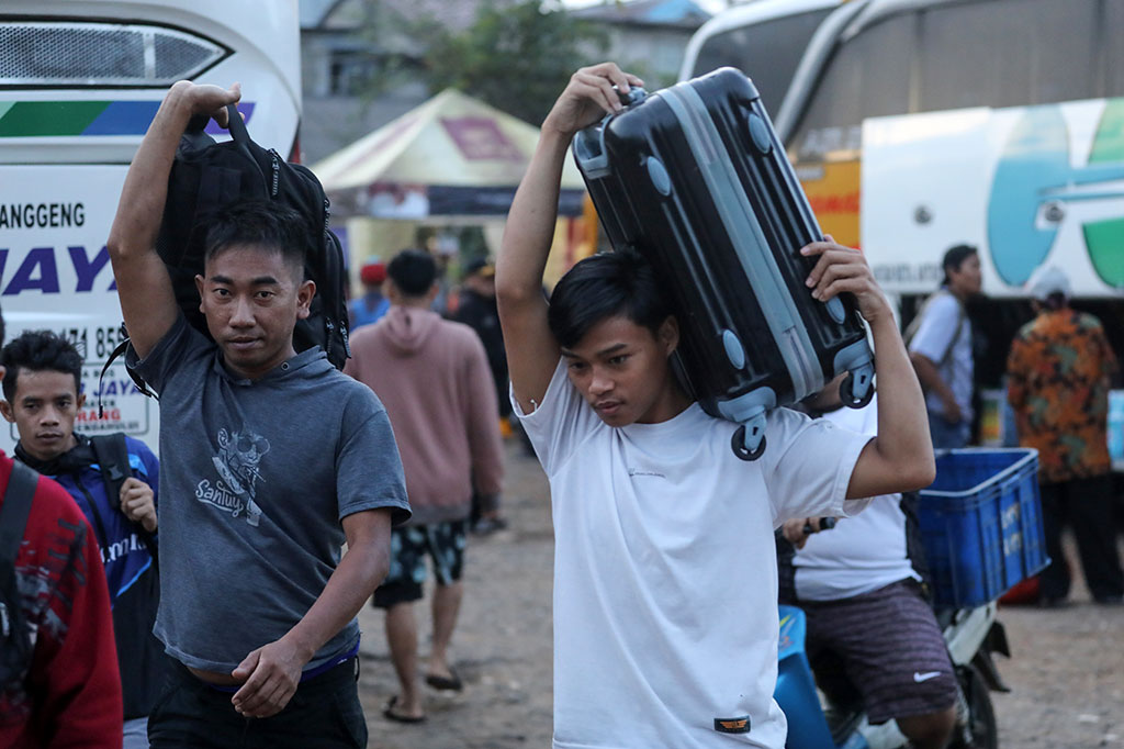 Jakarta: Pemudik tujuan Jawa Tengah antre memasukkan barang bawaan ke dalam bagasi bus yang akan ditumpanginya di Terminal Bayangan Pasar Cipulir, Jakarta Selatan, Rabu, 25 Maret 2025.