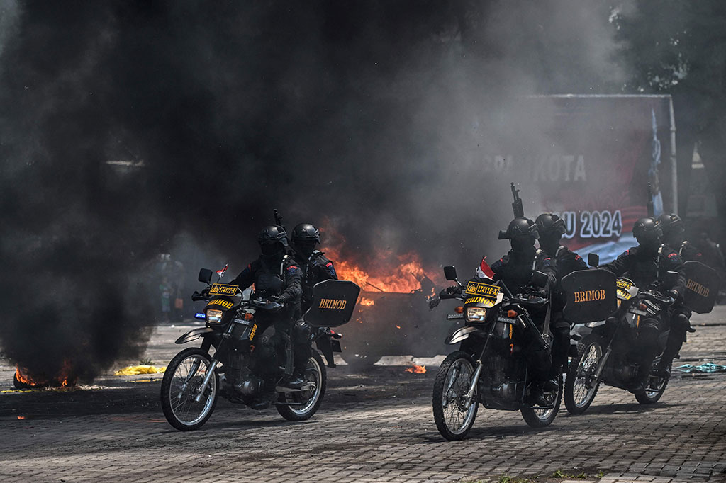 Dalam simulasi kali ini, diperagakan simulasi pengamanan berbagai tahapan Pemilu 2024 antara lain, persiapan pemilu berupa distribusi surat suara, masa kampanye, masa tenang, tahapan pemungutan suara, penetapan hasil pemungutan suara, hingga adanya unjuk rasa dari pihak yang menentang hasil Pemilu 2024 di KPU provinsi serta simulasi pembebasan sandera. AFP PHOTO/Juni Kriswanto
