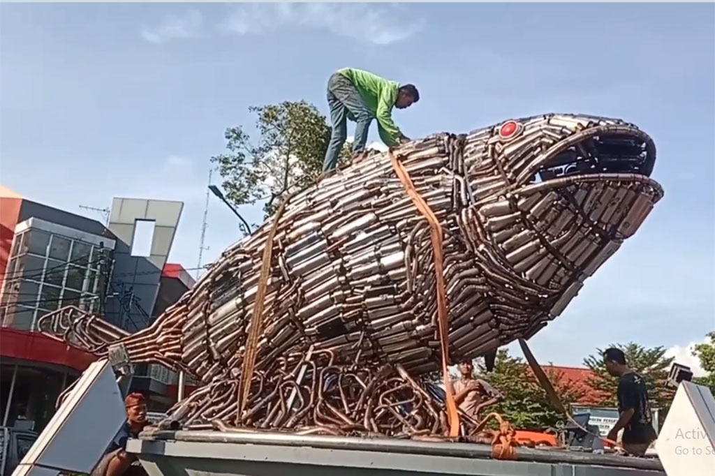 Pati: Ribuan knalpot brong disulap menjadi monumen bandeng di area Alun-Alun Kabupaten Pati, Jawa Tengah. Pembuatan monumen atau patung ikan bandeng tersebut diinisiasi oleh Polresta Pati. Pembuatan monumen ini menghabiskan 4.000 lebih knalpot brong, hasil razia selama 4 bulan.