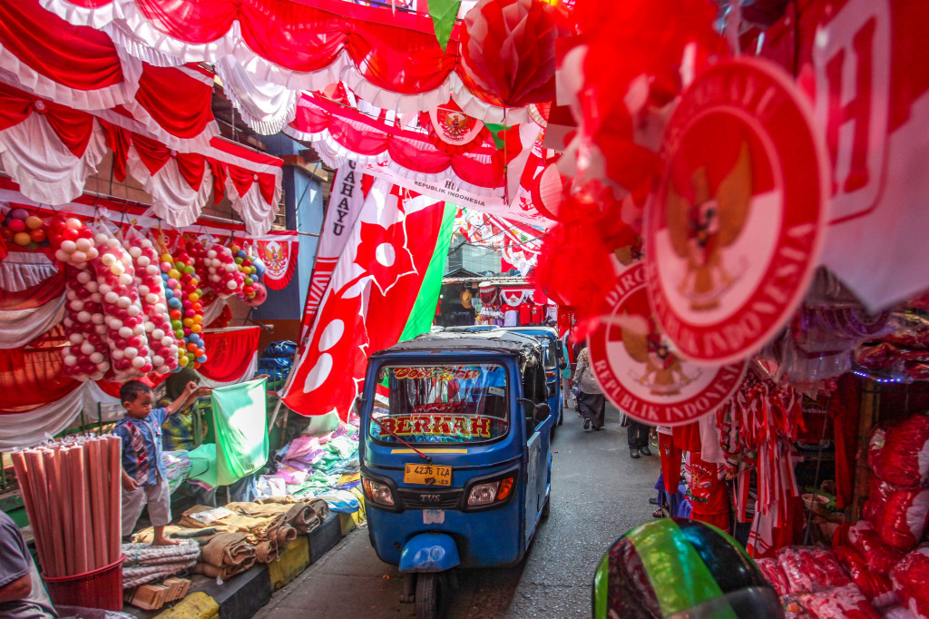 Jakarta: Hari Ulang Tahun (HUT) ke-80 Republik Indonesia tinggal hitungan hari lagi. Para pedagang pernak-pernik untuk kebutuhan hiasan Agustusan sangat marak di Pasar Jatinegara, Jakarta Timur, Rabu, 6 Agustus 2025.