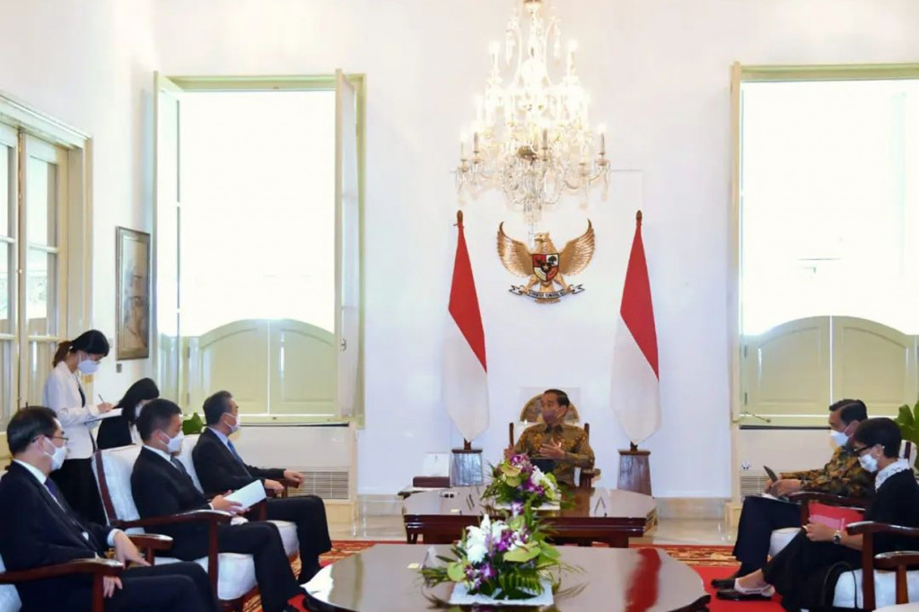 Presiden Joko Widodo (Jokowi) menerima kunjungan Menteri Luar Negeri (Menlu) Republik Rakyat Tiongkok (RRT) Wang Yi beserta delegasi di Istana Merdeka, Jakarta.