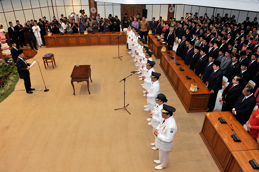 Metrotvnews.com, Denpasar: Gubernur Bali, Made Mangku Pastika mengambil sumpah enam kepala daerah dan wakil kepala daerah yang baru saat pelantikan di Kantor Gubernur Bali, Rabu (17/2/2016). Para kepala daerah hasil Pilkada serentak 9 Desember 2015 lalu itu akan memangku jabatan periode 2016-2021 di lima kabupaten di Bali dan Wali Kota Denpasar. ANTARA /Nyoman Budhiana Cek Berita dan Artikel yang lain di Google News