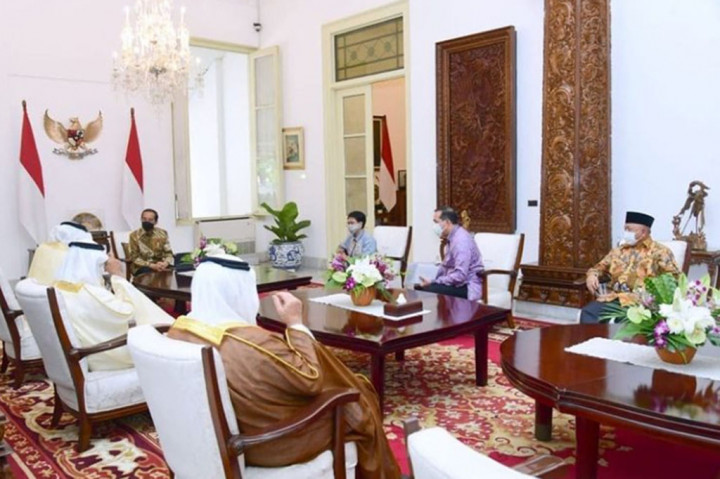 Jakarta: Presiden Joko Widodo menerima kunjungan kehormatan Menteri Negara Urusan Perdagangan Luar Negeri Persatuan Uni Emirat Arab (UAE) Thani bin Ahmed Al Zeyoudi di Istana Merdeka, Jumat, 3 September 2021.