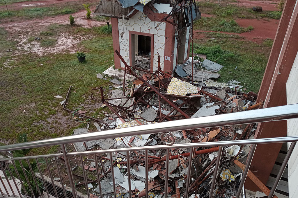 Menara yang terletak di halaman masjid ambruk sehingga materialnya menimpa sebagian atap bangunan utama masjid, sehingga mengalami kerusakan di sudut depan bagian kanan.