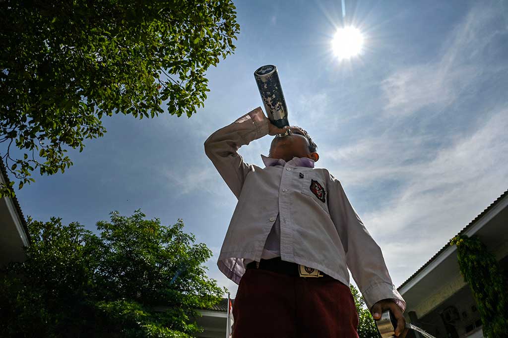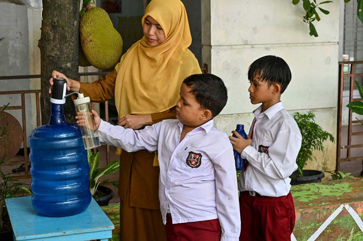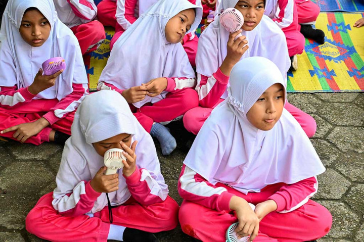 "Inisiatif ini tidak hanya bertujuan untuk memberikan kenyamanan selama jam belajar, tetapi juga mengedukasi siswa tentang pentingnya beradaptasi dengan cuaca ekstrem seperti sekarang," demikian Sarniyati Yusmanita. AFP PHOTO/Chaideer Mahyuddin
