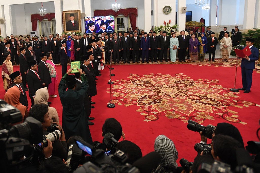 Jakarta: Presiden Joko Widodo melantik menteri dan pejabat setingkat menteri dalam Kabinet Indonesia Maju Periode 2019-2024. Pelantikan dilaksanakan di Istana Negara, Jakarta, Rabu, 23 Oktober 2019. Antara Foto/Wahyu Putro A Cek Berita dan Artikel yang lain di Google News