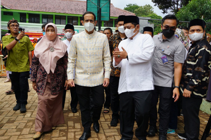 Jakarta: Menteri Pendidikan, Kebudayaan, Riset, dan Teknologi (Mendikbudristek) Nadiem Anwar Makarim mengunjungi Madrasah Tsanawiyah Negeri (MTsN) 19 Jakarta, Pondok Labu, Jakarta Selatan, Jumat, 7 Oktober 2022. Kunjungan Nadiem untuk menyampaikan bela sungkawa atas bencana banjir yang terjadi sehari sebelumnya dan mengakibatkan tiga siswa meninggal dunia.