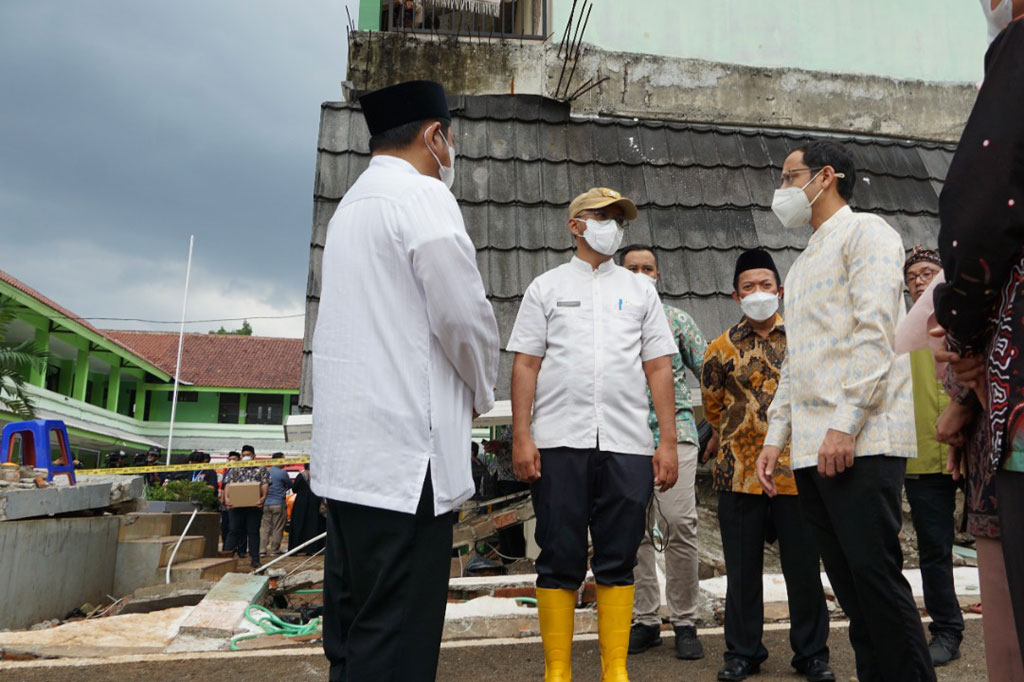 Disambut oleh Kepala Sekolah MTsN 19 Jakarta, Mendikbudristek Nadiem Makarim meninjau lokasi gedung sekolah yang temboknya runtuh diterjang banjir dan mengakibatkan tiga pelajar meninggal dunia.