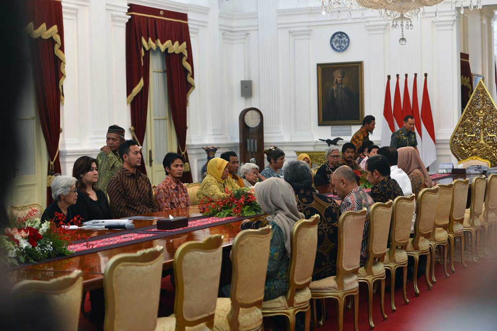 Jakarta: Presiden Joko Widodo menerima peserta aksi Kamisan, yakni para keluarga korban pelanggaran hak asasi manusia yang biasa menggelar aksi di depan Istana Kepresidenan. Sebanyak 20 peserta aksi Kamisan diterima Presiden di Istana Merdeka Jakarta, Kamis, 31 Mei 2018 sekitar pukul 15.00 WIB. Antara Foto/Wahyu Putro A Cek Berita dan Artikel yang lain di Google News