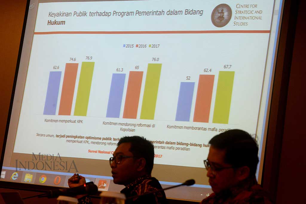 Metrotvnews.com, Jakarta: Hasil survei lembaga Centre for Strategic and International Studies (CSIS) menunjukkan tingkat kepuasan publik terhadap kinerja Pemerintahan Joko Widodo-Jusuf Kalla mengalami peningkatan selama tiga tahun terakhir. MI/Susanto Cek Berita dan Artikel yang lain di Google News