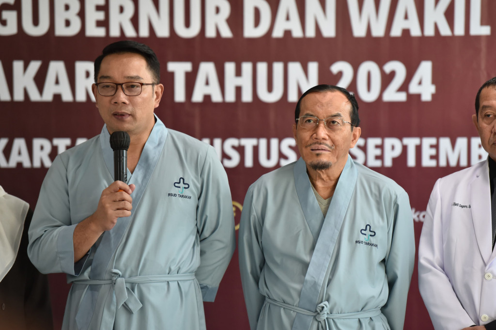 Jakarta: Calon gubernur dan wakil gubernur Pemilihan Kepala Daerah (Pilkada) Jakarta 2024, Ridwan Kamil (RK) dan Suswono, menjalani tes kesehatan di RSUD Tarakan, Gambir, Jakarta Pusat. Keduanya mengaku mengonsumsi vitamin 'd' yang disebut sebagai doa.